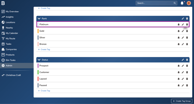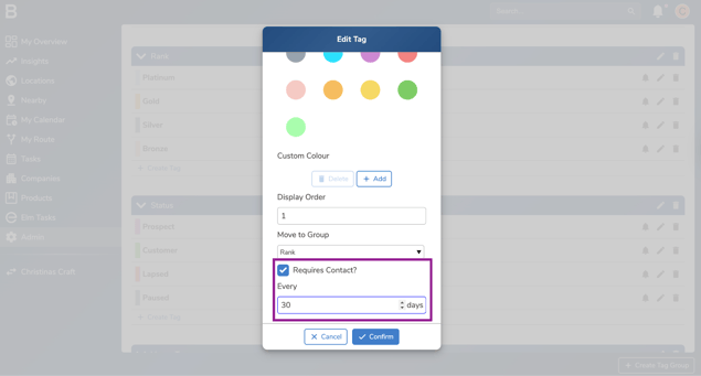 - In the Tag tab, select the edit button next to the tag you would like to set up the “Requires Contact” frequency with.