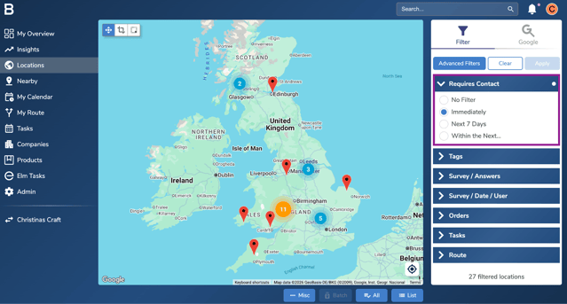 - Navigate to the locations and use the “Requires Contact filter” to access the accounts that need immediate contact or in coming days.