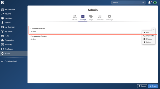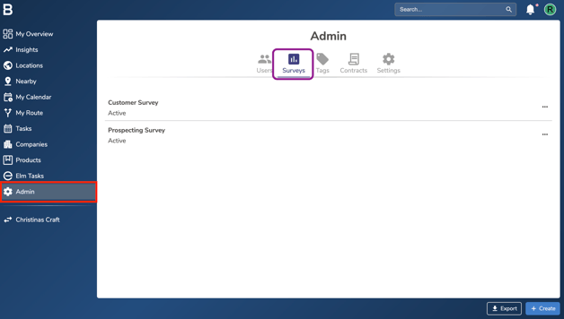 Navigate to the Admin tab in your account and click on 'Surveys'.