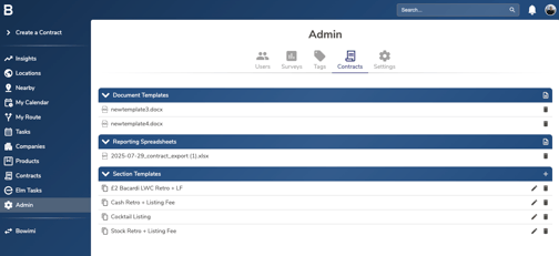 First, head to "Admin" > "Contracts" and under the "Section Templates" header you'll see all of your templates. Each template can be edited or deleted.
