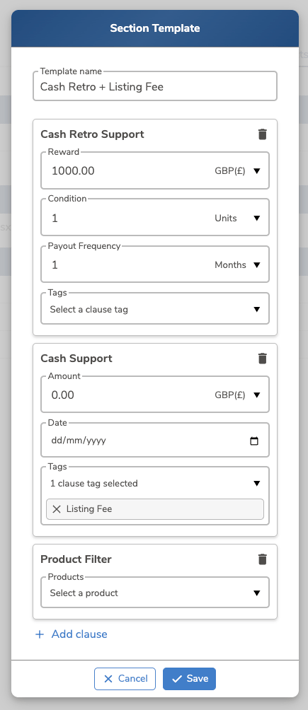 - Numbers are easy to replace for your team, so use the most common values to save your team time (e.g. if most of your retros are £1 per bottle, paying quarterly, then pre-fill a Cash Retro Support clause with Reward = 1, Currency = GBP, Condition = 1 unit, Payout Frequency = 3 months).