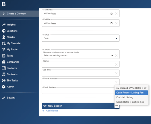 Users can quickly build contracts by using section templates, to add a section template, click on the button on the right side of the "New Section" bar. As you can see below, when clicked, it will show the user a list of available templates to choose from.