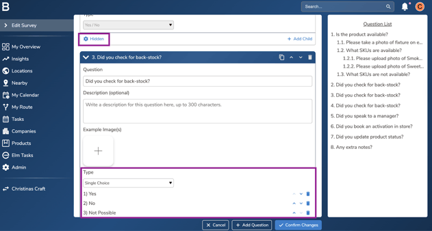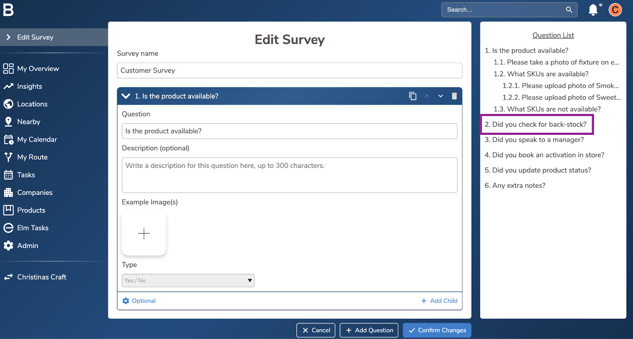 Surveys are essential for accurately capturing the data you need during location visits. They consist of a series of questions, which can be nested and include various question types. This guide provides instructions on how to modify a survey within the system.