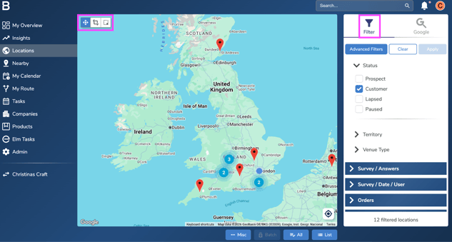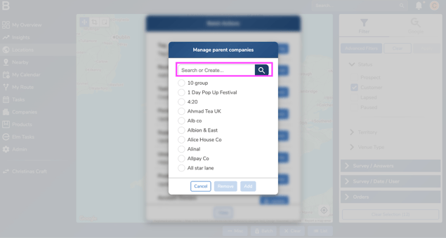- Select the locations you want to remove the Parent company from. You can use the cropping tool on the top left corner or the filters on the right to filter locations.